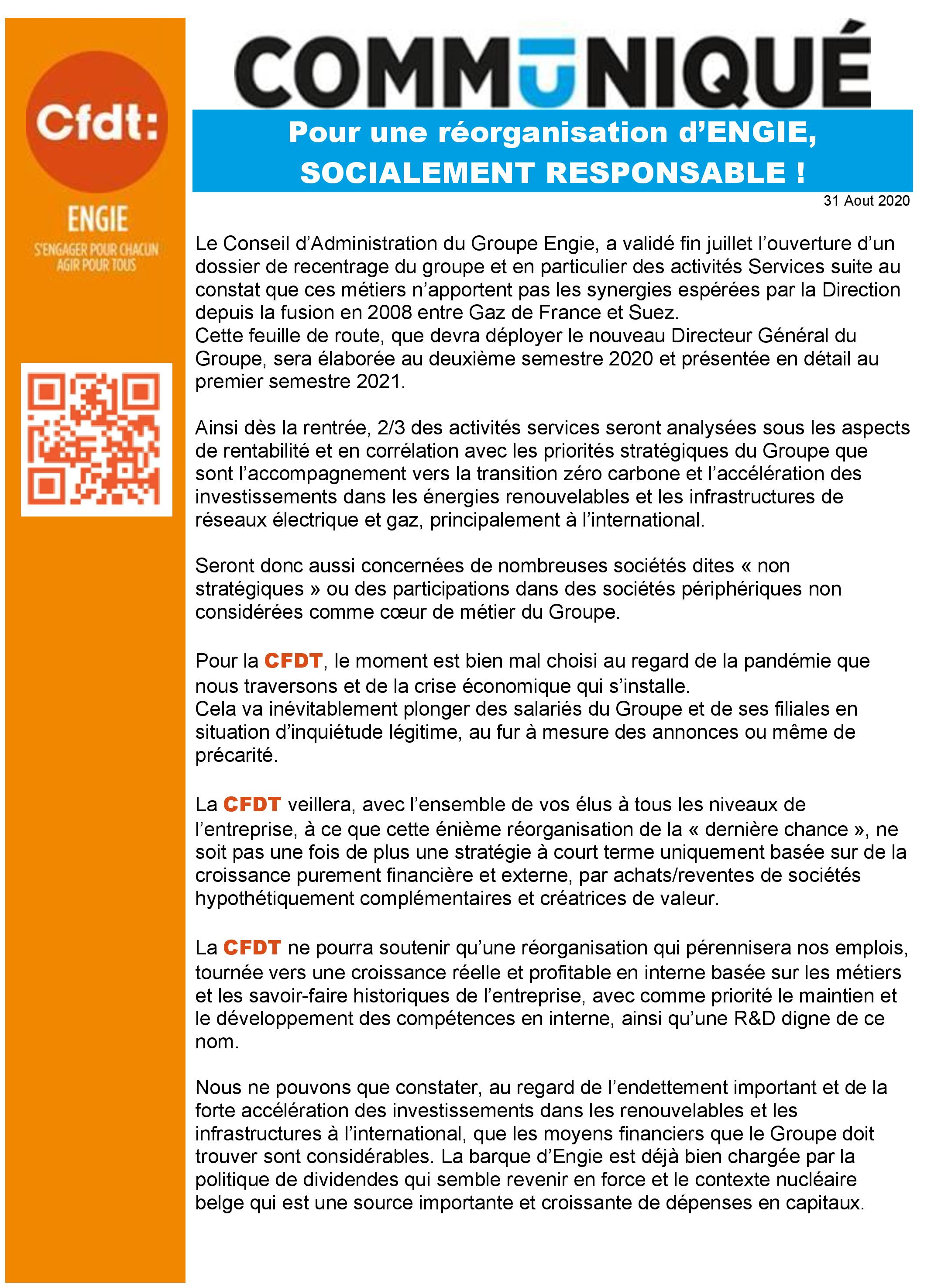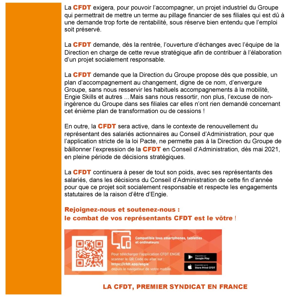 Sachez que la CFDT Engie est sur ce dossier à 1000%, que notre coordination accompagne non seulement les élu(e)s d’Engie Solution mais aussi notre section afin de nous tenir informée et nous préparée à toute éventualité.